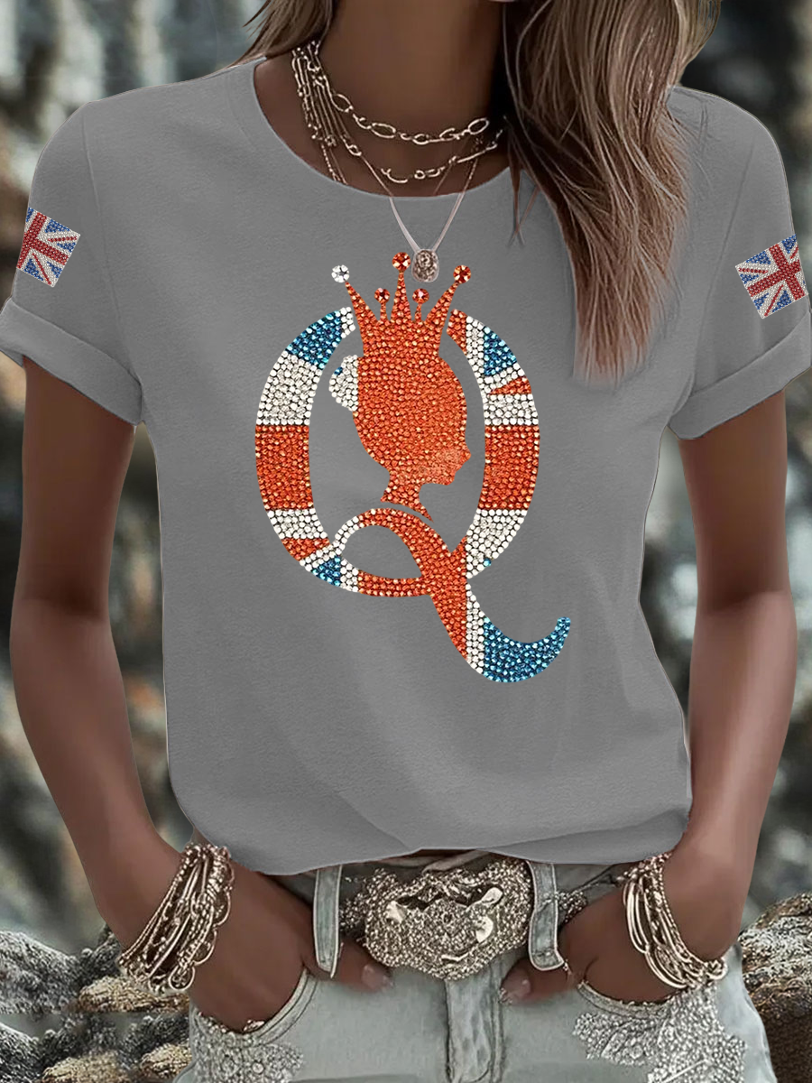 Women's British imitation diamond hot-drilling Printed Iron On Short Sleeve T-Shirt